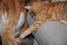 Zeus, a kind Pit Bull, shares a quiet moment with a kitten on the bed with the television in the background. Anyone know what they’re not watching?